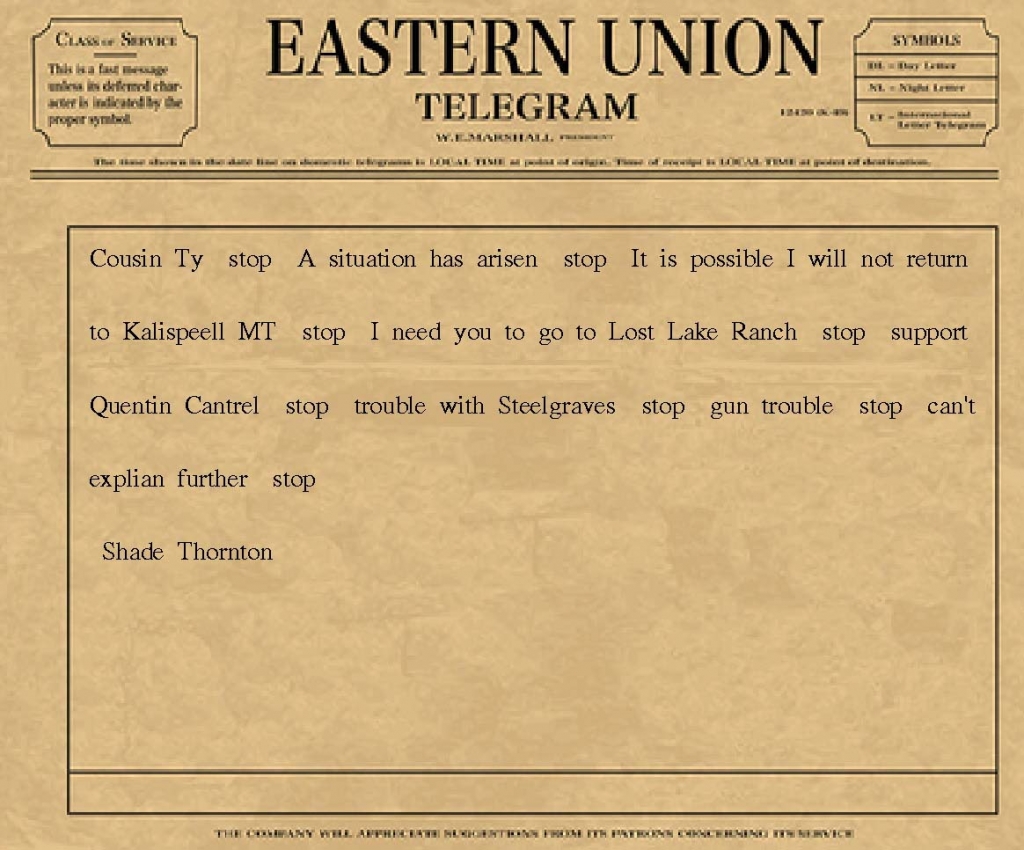 "Well now, Shade Thornton. Ain't heard from him since we were boys." Tyrell said more to himself than the others. Of course, the men gathered around to see the paper, not that most of them could read, it just wasn't common place for a telegram to come for one of the men on the Lazy S, not even Alvarado Muncy, himself.