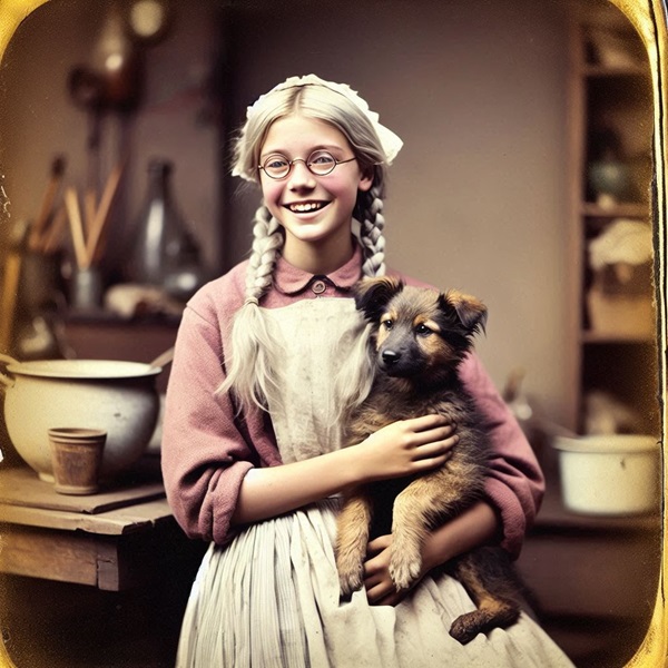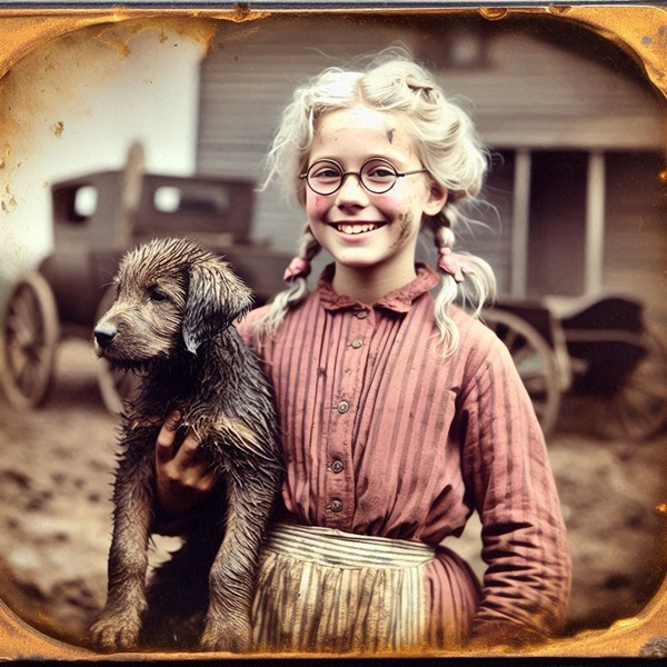 At Addy's whirlwind entrance, she jumped up: half in fright and half in deference to an adult entering the room. She was a bit amazed to have a pup thrust into her hands by the unseeing women, but, brought up by a rather terrifying mother, obeyed the command to wash the cute little rascal with alacrity and a willing "Yes Ma'am!!" and she ran out the back after Weedy to report on their new - well, task or chore didn't really describe it - more like treat.
