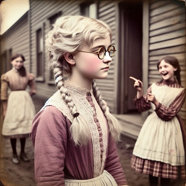 On the way, they were noticed by a couple of the girls from school, who didn't know which to do first: giggle, goggle, point, or put their heads together in whispered conclave: this would be all over the school-yard come Monday: Weedy Chappel and Froggy-Four-Eyes sitting in a tree: K.I.S.S.I.N.G. Well, they hadn't been seen actually kissing, but promenading the streets arm in arm was as good as. Jane pretended not to notice them staring, but felt a certain pleasure at it all the same, she couldn't wait to be teased about it by the other girls.