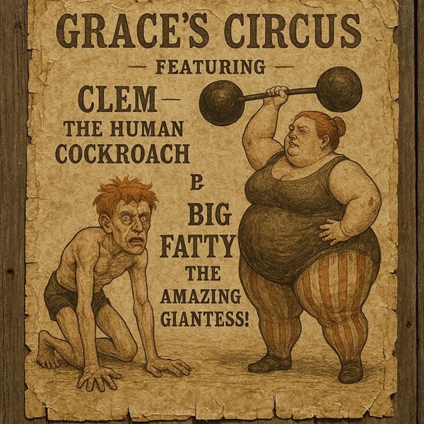 Sis was too busy stuffing her face with cookies to answer at first but eventually, speaking with her mouth full, grunted: "Clem, cept in the circus he was called 'The Human Cockroach'" then, after chewing and swallowing the remaining chud, the giantess added "Dunno when we was borned, just Ma onct said the war was just started and Daddy was a 'Spress rider, and he roded off an' never come back to us... but one day he might. Ma said he probably was a good feller but never even knowed we was borned so din comeback to look after us."