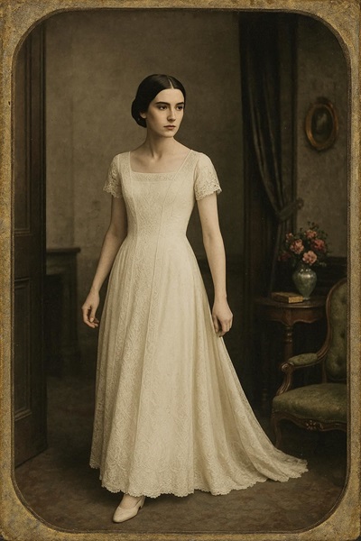 "No, no, no, Miss Fletcher, this IS the dress! It's simplicity itself - so plain that it serves merely as a frame for your beauty!" It was not so much a suggestion as a dictat. She caught sight of herself in a mirror and yelped "Oh!! And maybe something around the head - a simple garland of daisies or..." she deftly grabbed a white table cloth that covered a side table upon which were various knickknacks and curios and did the old conjuror's trick of whipping it off while the objects remained on the table.